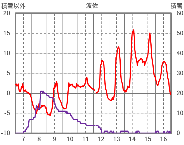 | 日 | 時 | 気温 | 降水 | 風向/風速 | 日照 | 積雪 | 降雪 |