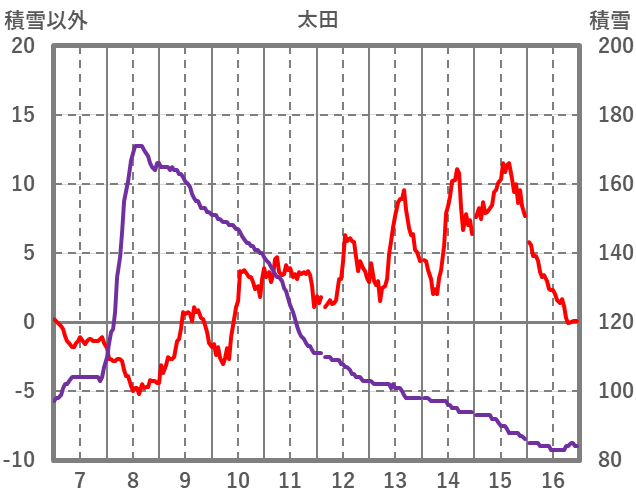 | 日 | 時 | 気温 | 降水 | 風向/風速 | 日照 | 積雪 | 降雪 |