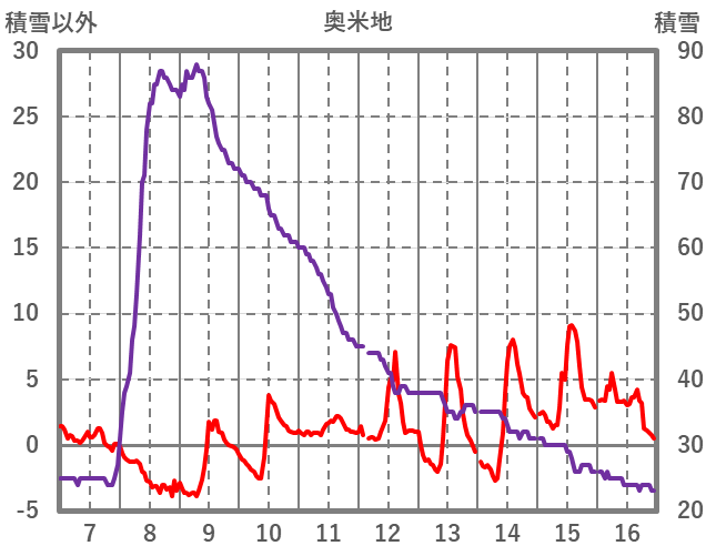 | 日 | 時 | 気温 | 降水 | 風向/風速 | 日照 | 積雪 | 降雪 |