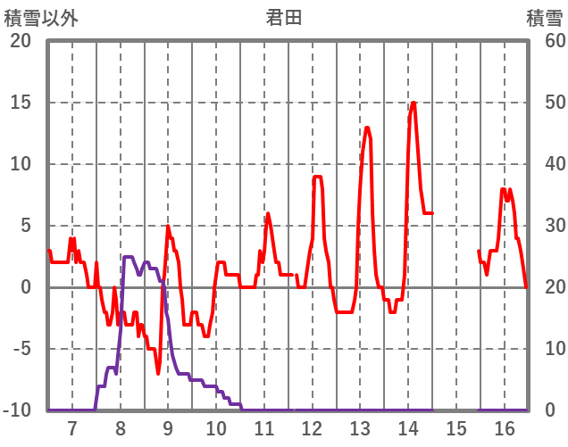 | 日 | 時 | 気温 | 降水 | 風向/風速 | 日照 | 積雪 | 降雪 |