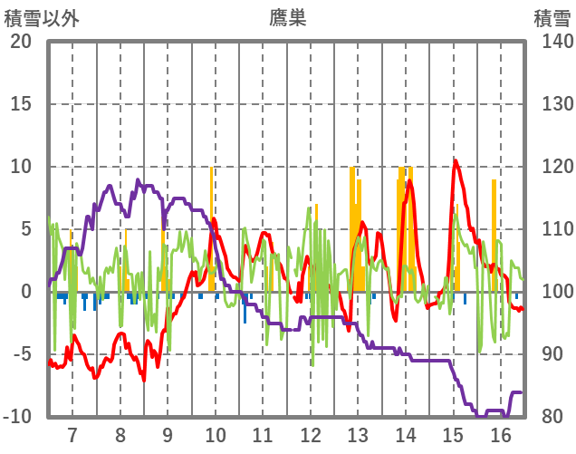 | 日 | 時 | 気温 | 降水 | 風向/風速 | 日照 | 積雪 | 降雪 |
