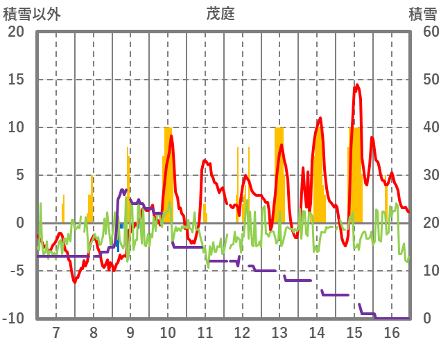 | 日 | 時 | 気温 | 降水 | 風向/風速 | 日照 | 積雪 | 降雪 |