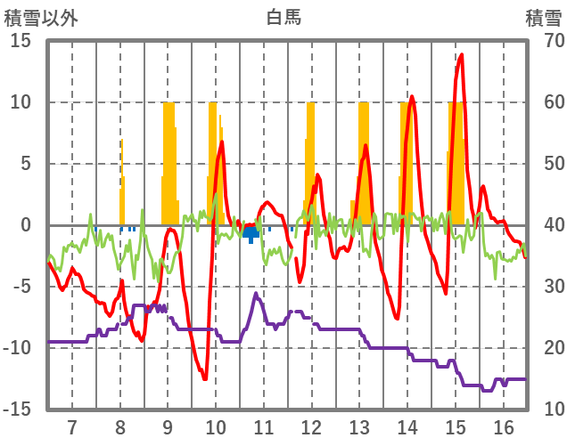 | 日 | 時 | 気温 | 降水 | 風向/風速 | 日照 | 積雪 | 降雪 |