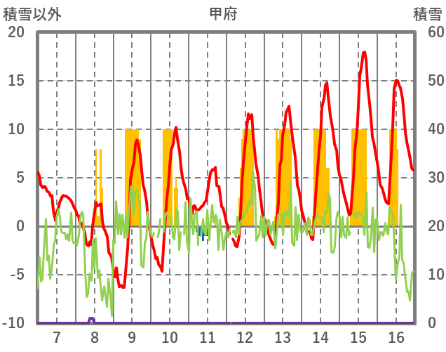 | 日 | 時 | 気温 | 降水 | 風向/風速 | 日照 | 積雪 | 降雪 |