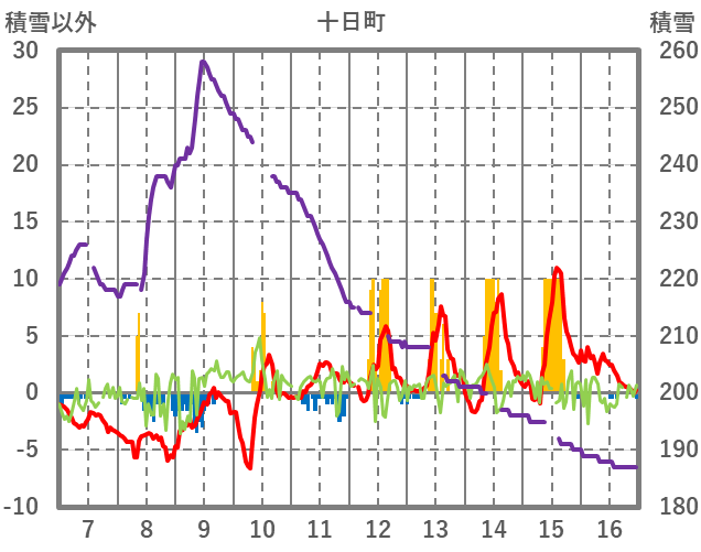 | 日 | 時 | 気温 | 降水 | 風向/風速 | 日照 | 積雪 | 降雪 |