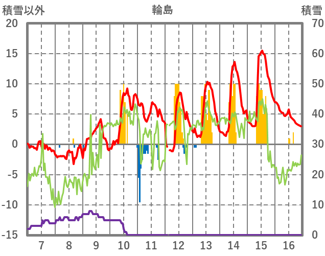 | 日 | 時 | 気温 | 降水 | 風向/風速 | 日照 | 積雪 | 降雪 |