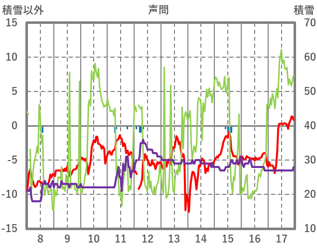 | 日 | 時 | 気温 | 降水 | 風向/風速 | 日照 | 積雪 | 降雪 |