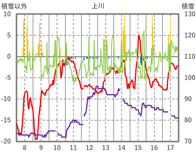 | 日 | 時 | 気温 | 降水 | 風向/風速 | 日照 | 積雪 | 降雪 |