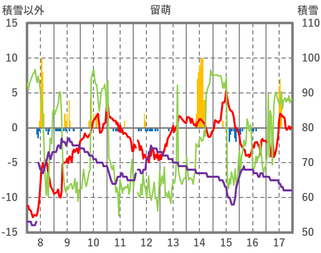 | 日 | 時 | 気温 | 降水 | 風向/風速 | 日照 | 積雪 | 降雪 |