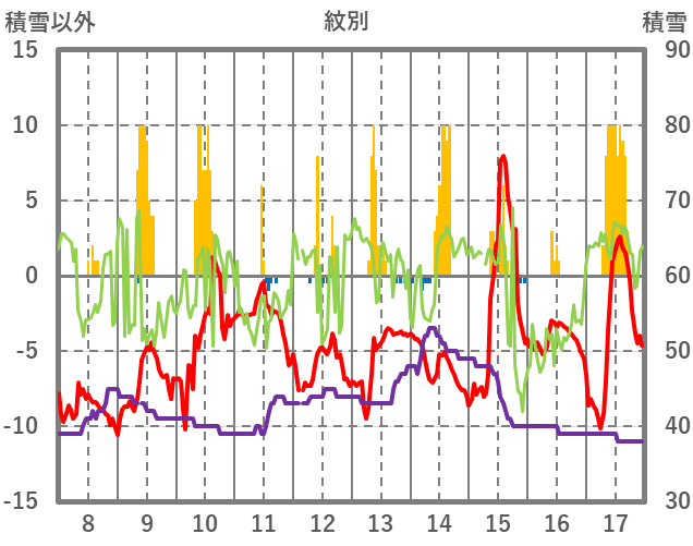 | 日 | 時 | 気温 | 降水 | 風向/風速 | 日照 | 積雪 | 降雪 |
