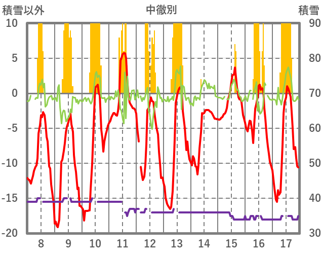| 日 | 時 | 気温 | 降水 | 風向/風速 | 日照 | 積雪 | 降雪 |
