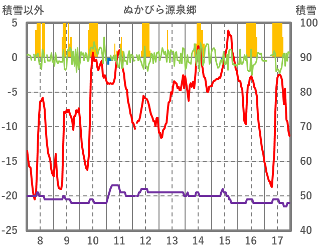 | 日 | 時 | 気温 | 降水 | 風向/風速 | 日照 | 積雪 | 降雪 |
