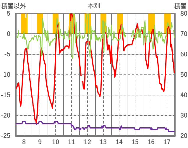 | 日 | 時 | 気温 | 降水 | 風向/風速 | 日照 | 積雪 | 降雪 |