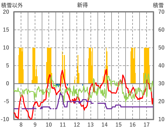 | 日 | 時 | 気温 | 降水 | 風向/風速 | 日照 | 積雪 | 降雪 |