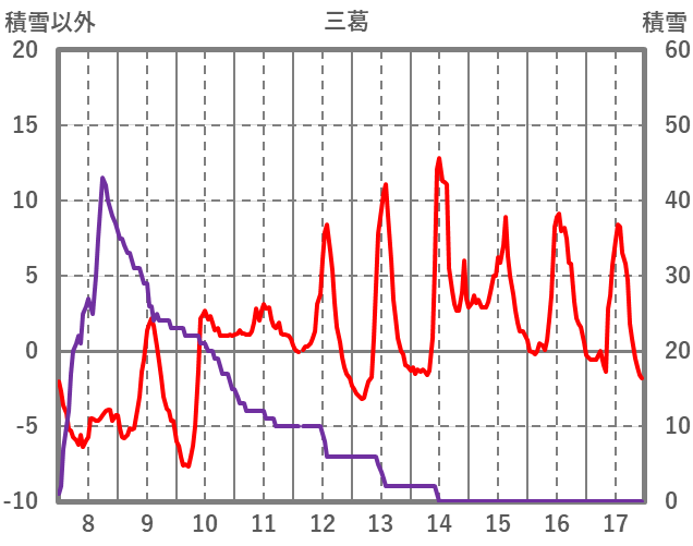 | 日 | 時 | 気温 | 降水 | 風向/風速 | 日照 | 積雪 | 降雪 |