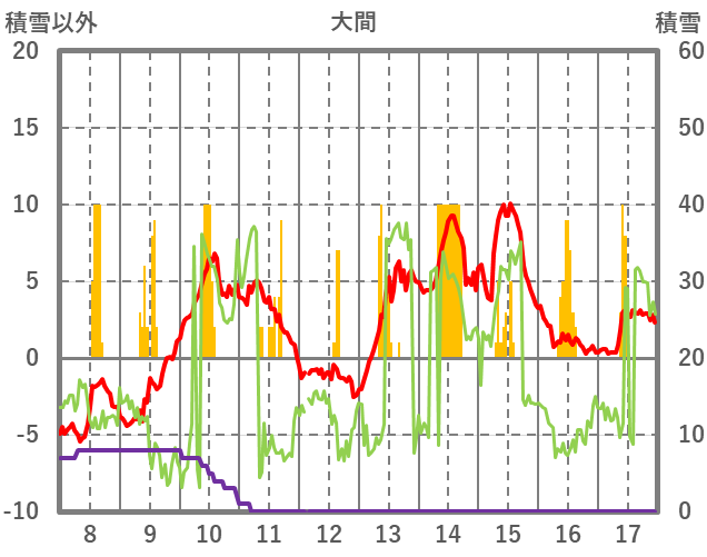 | 日 | 時 | 気温 | 降水 | 風向/風速 | 日照 | 積雪 | 降雪 |