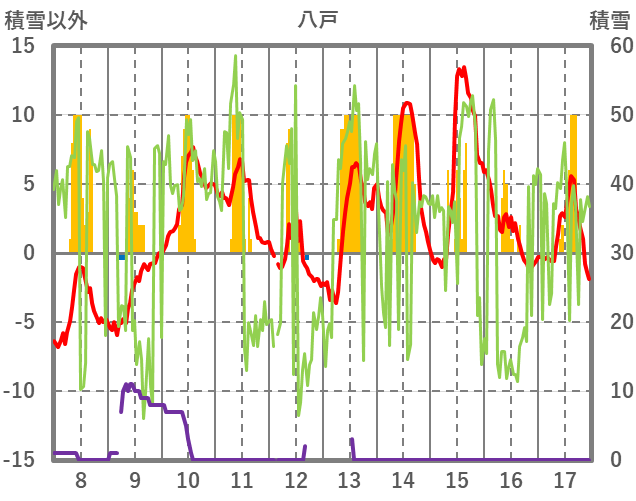 | 日 | 時 | 気温 | 降水 | 風向/風速 | 日照 | 積雪 | 降雪 |