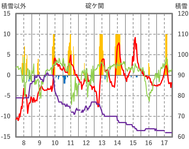 | 日 | 時 | 気温 | 降水 | 風向/風速 | 日照 | 積雪 | 降雪 |