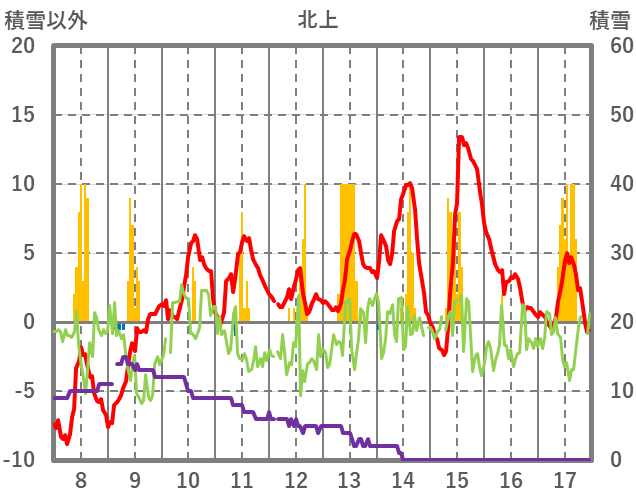 | 日 | 時 | 気温 | 降水 | 風向/風速 | 日照 | 積雪 | 降雪 |