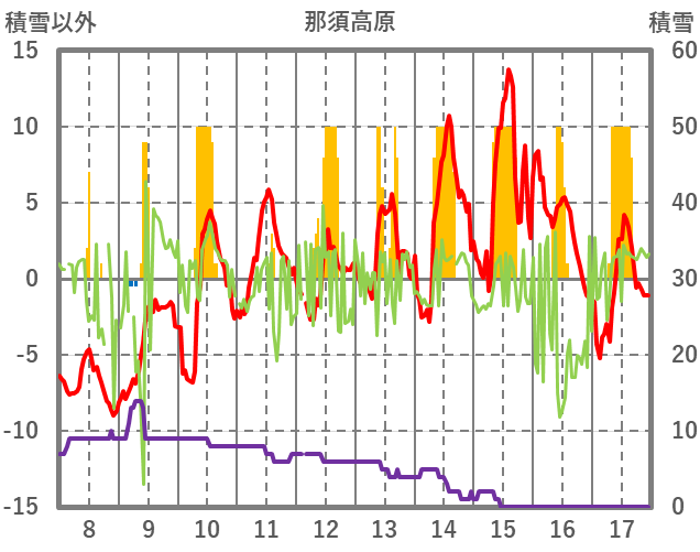 | 日 | 時 | 気温 | 降水 | 風向/風速 | 日照 | 積雪 | 降雪 |