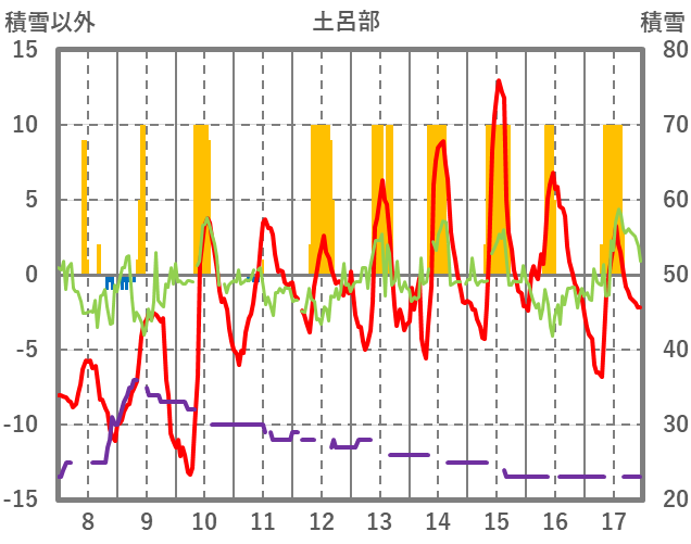 | 日 | 時 | 気温 | 降水 | 風向/風速 | 日照 | 積雪 | 降雪 |