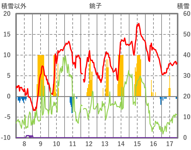 | 日 | 時 | 気温 | 降水 | 風向/風速 | 日照 | 積雪 | 降雪 |