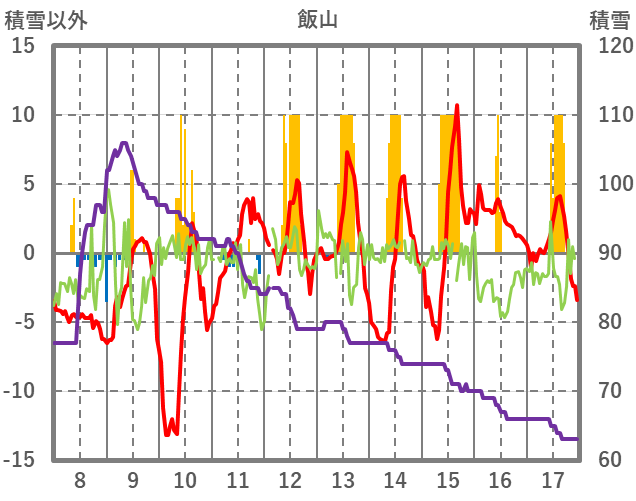 | 日 | 時 | 気温 | 降水 | 風向/風速 | 日照 | 積雪 | 降雪 |