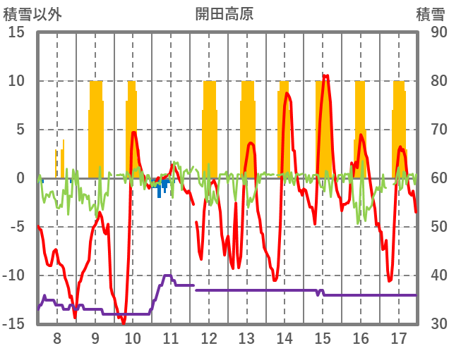 | 日 | 時 | 気温 | 降水 | 風向/風速 | 日照 | 積雪 | 降雪 |