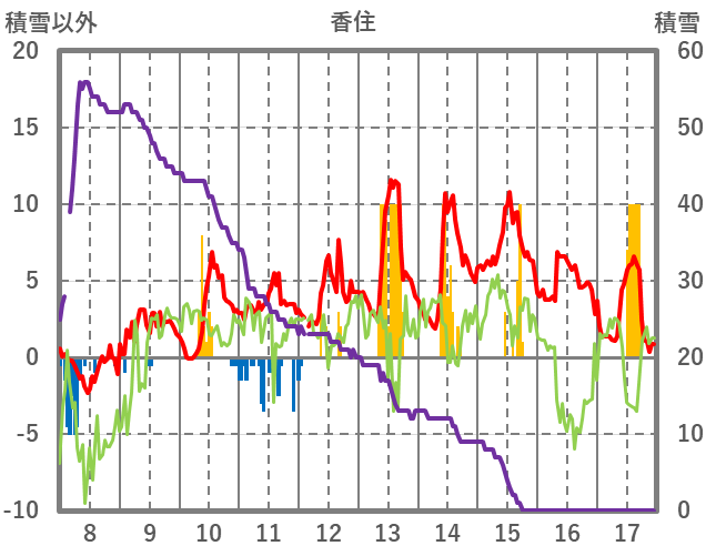| 日 | 時 | 気温 | 降水 | 風向/風速 | 日照 | 積雪 | 降雪 |