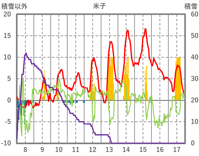| 日 | 時 | 気温 | 降水 | 風向/風速 | 日照 | 積雪 | 降雪 |