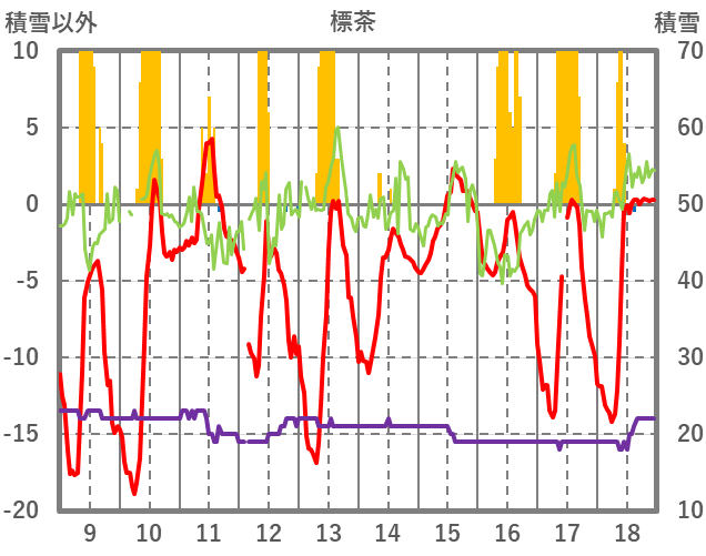 | 日 | 時 | 気温 | 降水 | 風向/風速 | 日照 | 積雪 | 降雪 |