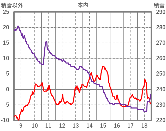 | 日 | 時 | 気温 | 降水 | 風向/風速 | 日照 | 積雪 | 降雪 |