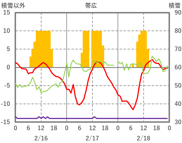 | 日 | 時 | 気温 | 降水 | 風向/風速 | 日照 | 積雪 | 降雪 |