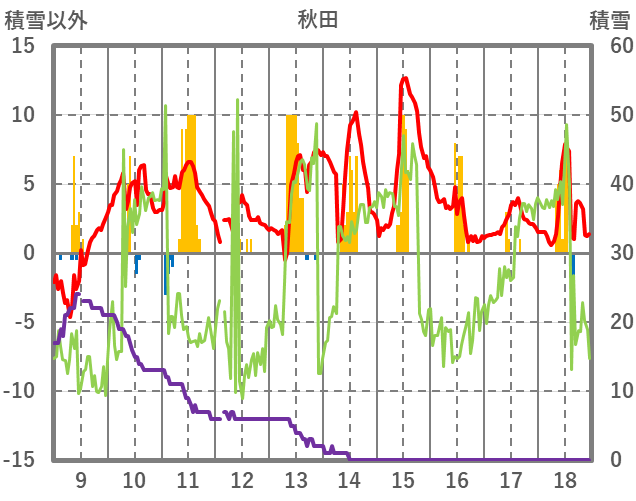 | 日 | 時 | 気温 | 降水 | 風向/風速 | 日照 | 積雪 | 降雪 |