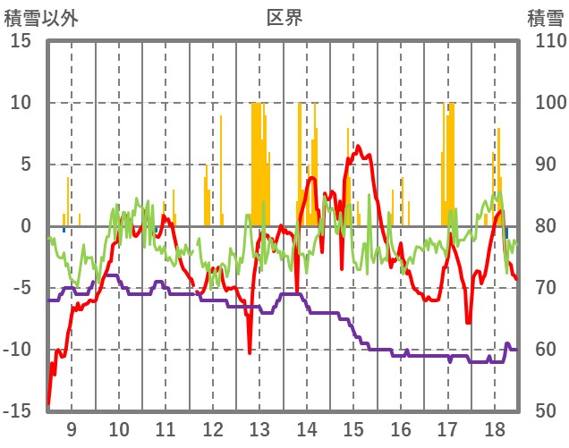 | 日 | 時 | 気温 | 降水 | 風向/風速 | 日照 | 積雪 | 降雪 |