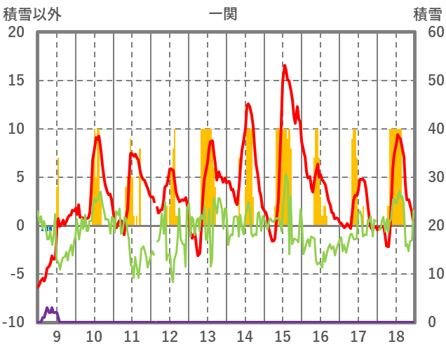 | 日 | 時 | 気温 | 降水 | 風向/風速 | 日照 | 積雪 | 降雪 |