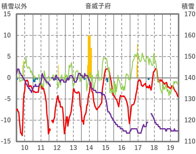 | 日 | 時 | 気温 | 降水 | 風向/風速 | 日照 | 積雪 | 降雪 |