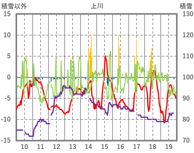 | 日 | 時 | 気温 | 降水 | 風向/風速 | 日照 | 積雪 | 降雪 |