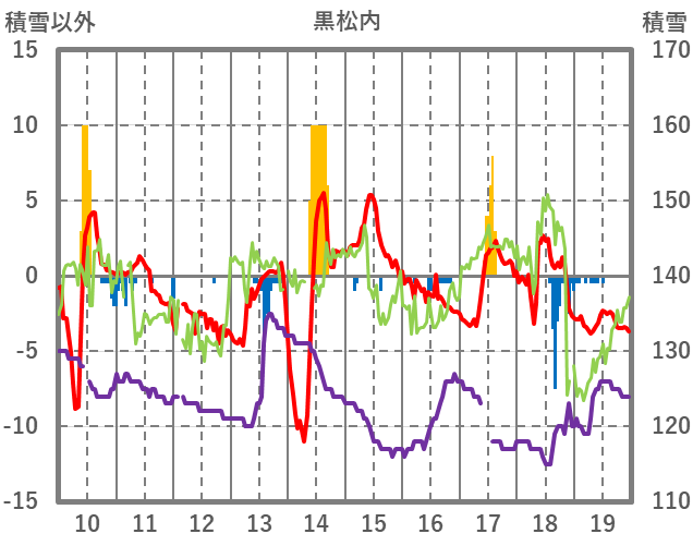 | 日 | 時 | 気温 | 降水 | 風向/風速 | 日照 | 積雪 | 降雪 |