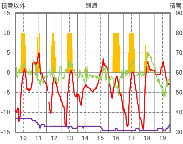 | 日 | 時 | 気温 | 降水 | 風向/風速 | 日照 | 積雪 | 降雪 |