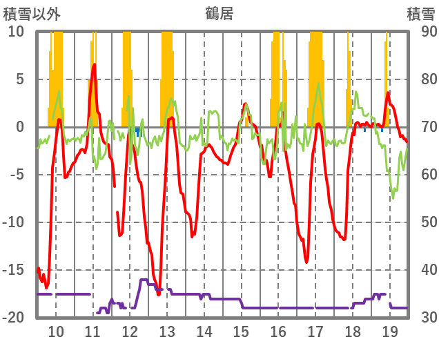 | 日 | 時 | 気温 | 降水 | 風向/風速 | 日照 | 積雪 | 降雪 |