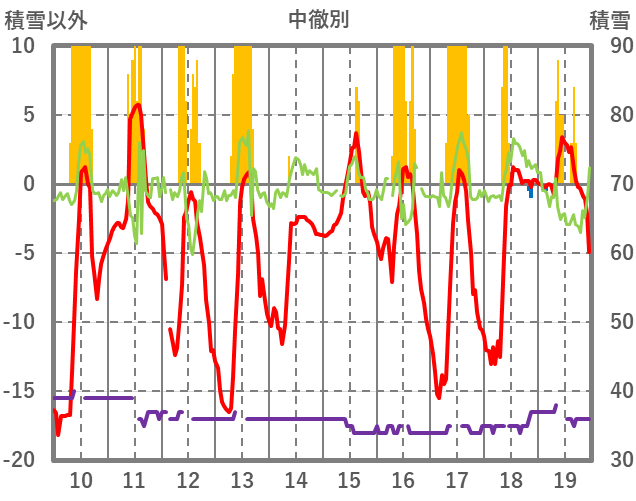 | 日 | 時 | 気温 | 降水 | 風向/風速 | 日照 | 積雪 | 降雪 |