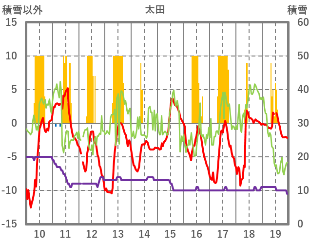 | 日 | 時 | 気温 | 降水 | 風向/風速 | 日照 | 積雪 | 降雪 |