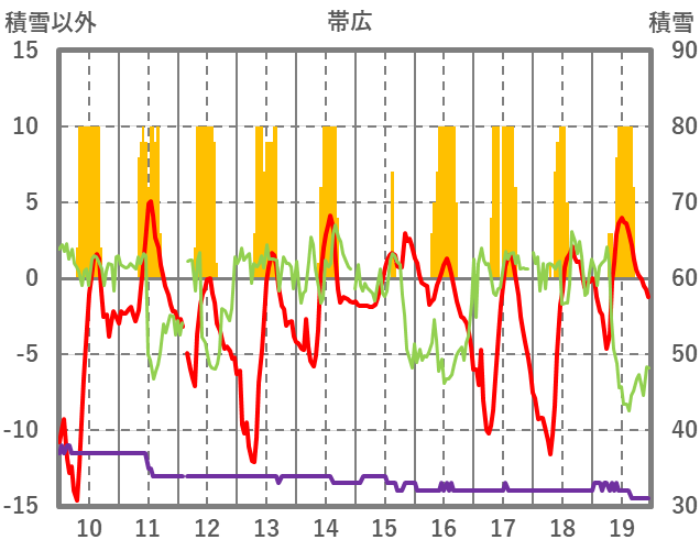 | 日 | 時 | 気温 | 降水 | 風向/風速 | 日照 | 積雪 | 降雪 |