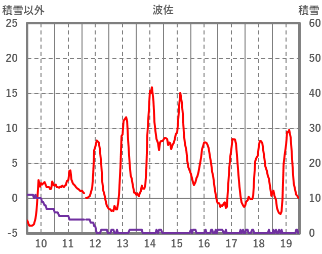 | 日 | 時 | 気温 | 降水 | 風向/風速 | 日照 | 積雪 | 降雪 |