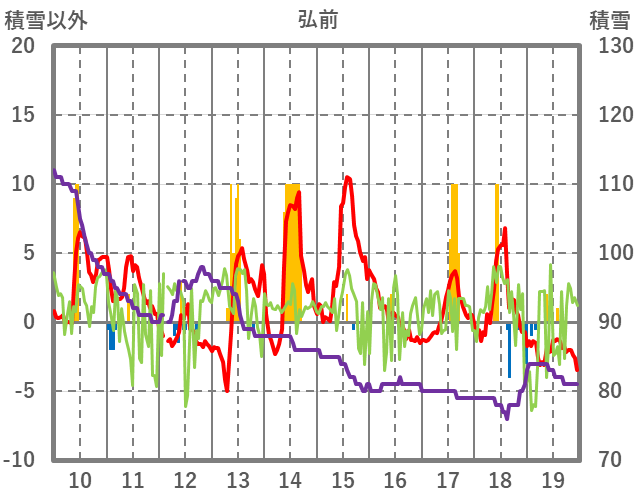 | 日 | 時 | 気温 | 降水 | 風向/風速 | 日照 | 積雪 | 降雪 |