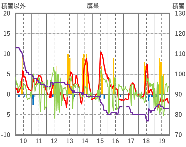 | 日 | 時 | 気温 | 降水 | 風向/風速 | 日照 | 積雪 | 降雪 |