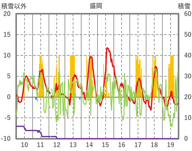 | 日 | 時 | 気温 | 降水 | 風向/風速 | 日照 | 積雪 | 降雪 |