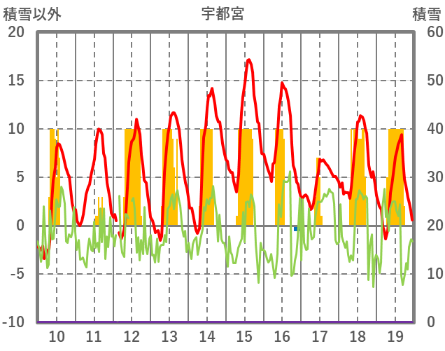 | 日 | 時 | 気温 | 降水 | 風向/風速 | 日照 | 積雪 | 降雪 |