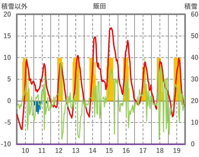 | 日 | 時 | 気温 | 降水 | 風向/風速 | 日照 | 積雪 | 降雪 |